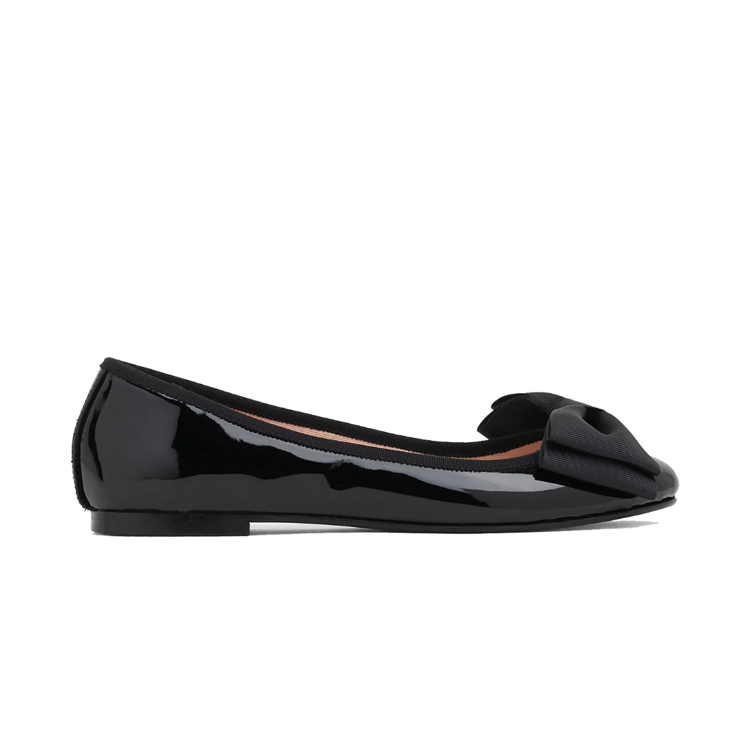 Step out in style! Eugenie is a classy and chic black patent ballet flats with an oversized bow for a sophisticated look.